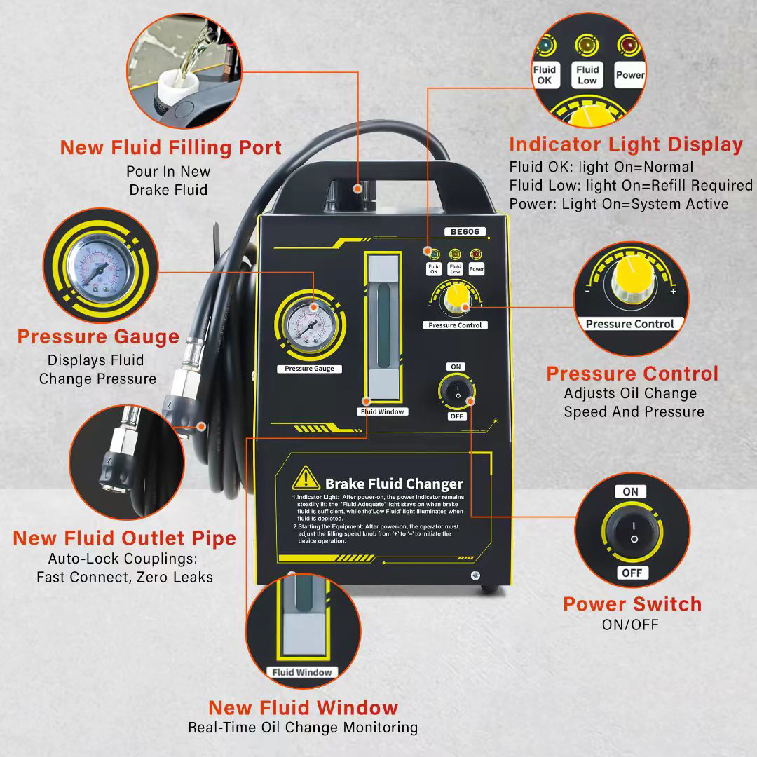 The use of automotive brake fluid for more than 2 years usually carries the risk of contamination and deterioration, resulting in liquefaction pollution and precipitation, causing a decrease in the boiling point of the brake fluid, air resistance in the brake pipeline, and lack of oil in the brake pump, leading to longer distance in braking distance, poor braking performance, and even brake failure can lead to serious consequences, so it is necessary to regularly check and maintain brake fluid. The traditional method of changing brake fluid is operated by at least two people. One person is stepping on the brake in the driver's cab, while the other person is cooperating to drain oil under the car chassis. This method not only causes waste brake fluid to leak all over the ground, seriously polluting the environment and consuming labor and time. And it is easy to penetrate the air and moisture, contaminate the brake fluid, and affect braking performance. So the repair shop adopts new brake fluid replacement equipment, which only requires one person to operate.Convenient, efficient and cost-effective schedule working hours and improve efficiency, enhance customer experience, and enable more brake maintenance services to be completed, resulting in higher profits.
